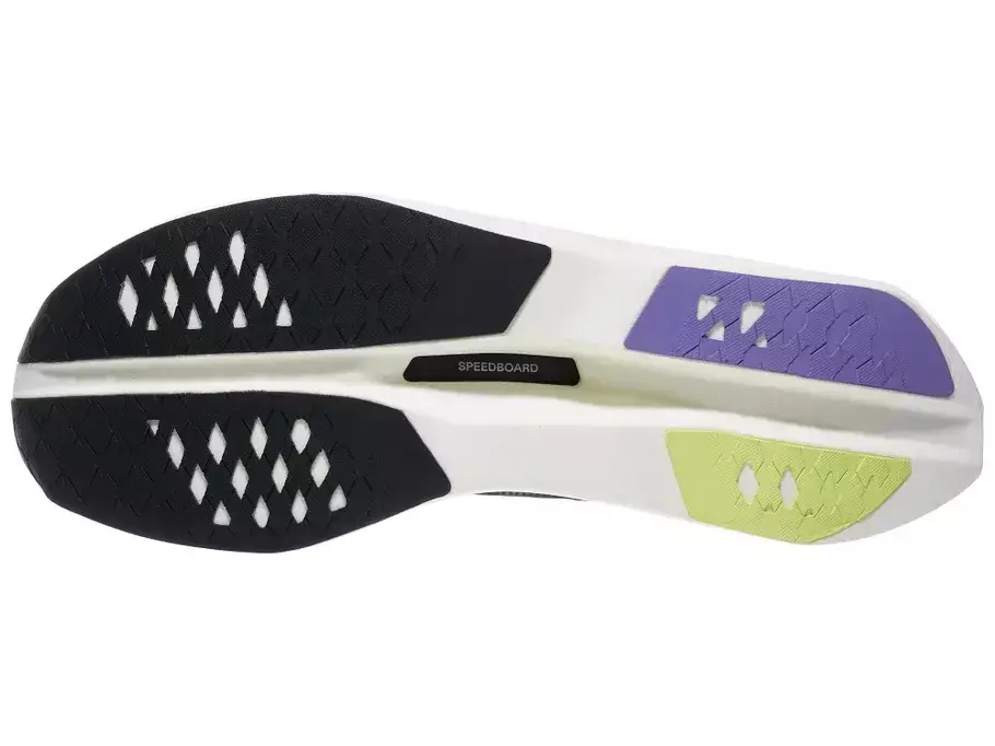 The Volt is a lightweight race day offering with two layers of Helion HF superfoam sandwiching a carbon Speedboard plate. The Helion HF layers deliver a double dose of responsive cushioning and energy return that you can feel, absorbing impact while helping to increase your running efficiency. The Speedboard plate flexes as you run, propelling you forward instead of up, so that you can run faster and remain energized for longer.